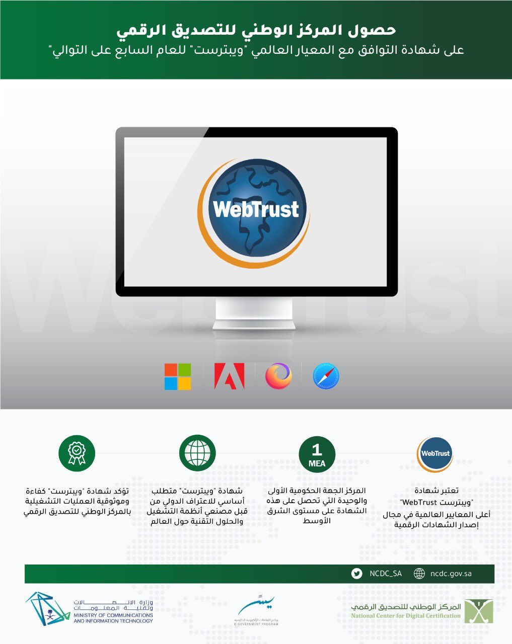 المركز الوطني للتصديق الرقمي En Twitter حصول المركز الوطني للتصديق الرقمي على شهادة التوافق مع المعيار العالمي ويبترست Webtrust للعام السابع على التوالي