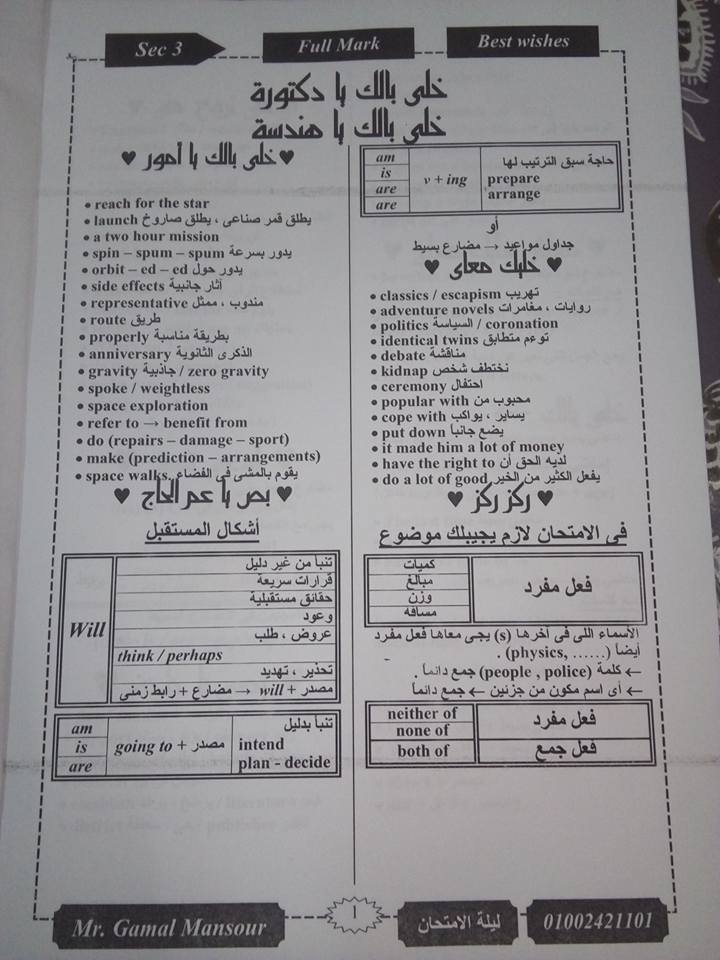 أحلى تلخيص لمنهج الانجليزى ثالثة ثانوي 8 ورقات مش هيخرج عنهم الامتحان ان شاء الله