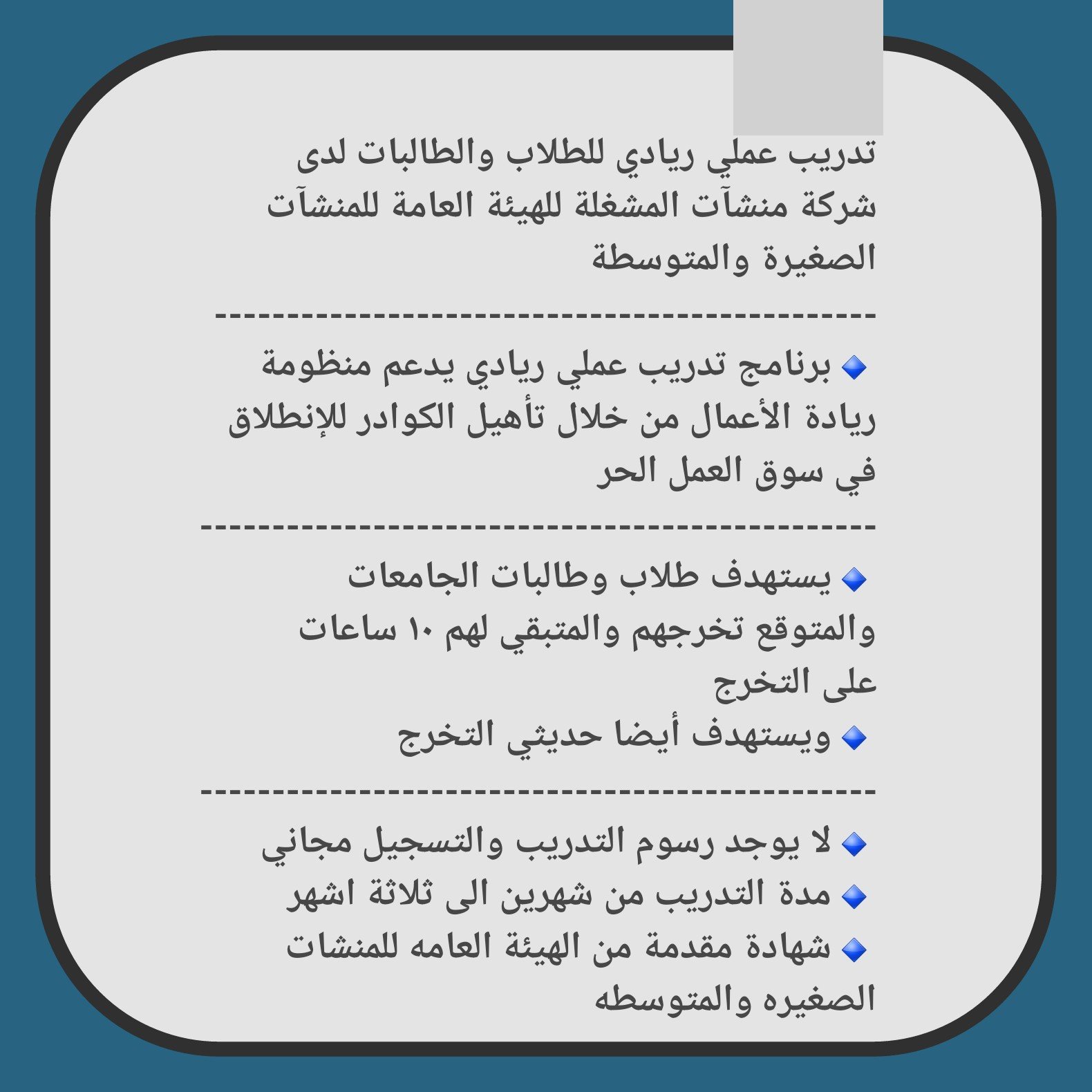 Uzivatel عبدالرحمن بن فهد Na Twitteru تدريب عملي عدة مدن تدريب عملي ريادي للطلاب والطالبات لدى شركة منشآت المشغلة للهيئة العامة للمنشآت الصغيرة والمتوسطة التدريب والتسجيل مجاني مدة التدريب من شهرين